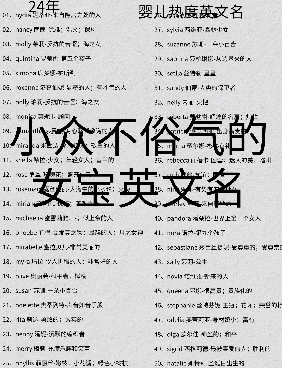Prudence意指“有智慧有远见之人,谨慎”,寓意女孩智慧且稳重Rosemary意为“大海中的小水珠,艾菊”,寓意女孩清新自然此外,还有以下一些独特好记的女生英文名Sebastiane意为“受尊重的,受尊崇的”,寓意女孩尊贵且有威严Antonia寓意为“无辞以赞,受尊崇的人”,彰显女孩的高贵品质。