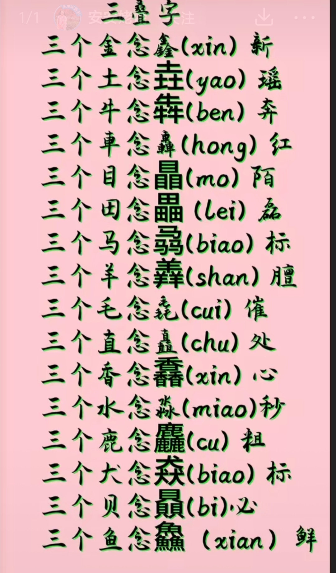 畾三个条田,读音léi皛三个白,读音xiǎo惢三颗心,读音suǒ 尛三个小,读音mó麤三个鹿,读音cū 龘三个龙,读音dá ,意古同“龖”,龙腾飞的样子 鑫三个金,读音xīn,意旧时商店字号人名用字,取其金多兴旺之意森三个木,读音sēn,意稠密垚三个土,读音yáo,意山高多用于人名壵三个士,读音。