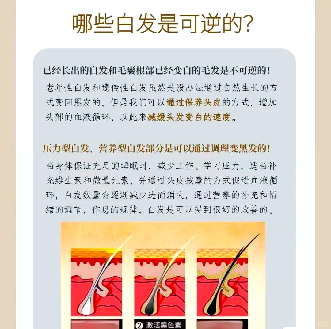 目前并没有科学研究证明存在可以使白发变黑发的秘方但以下方法可能有助于保持头发健康,延缓白发出现均衡饮食摄入富含维生素矿物质和抗氧化剂的食物,如蔬菜水果全谷类坚果和鱼类,能够为头发提供必要的营养支持这些营养素有助于维持毛囊健康,促进黑色素合成,从而延缓白发形成例如,维生素B。
