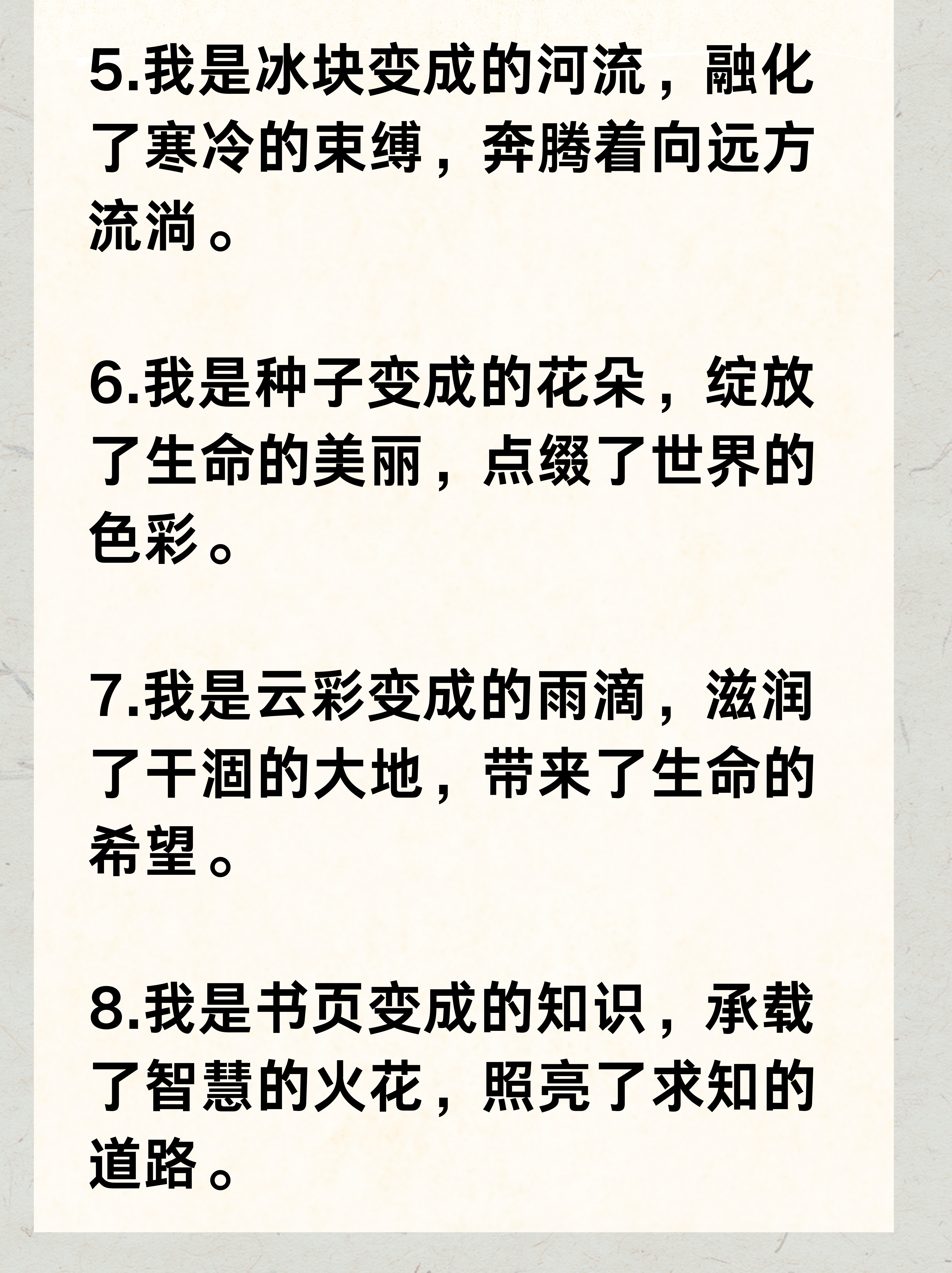 15、8 我愿成为一支蜡烛,驱散黑暗,带来希望9 我期望成为盲人的眼睛,为他们带来光明,让他们的生活重焕活力10 我渴望成为一位仙子,随心所欲地游历各地11 我期待参与北京的升旗仪式,感受那庄严肃穆的时刻12 我迫不及待地想与同学们团聚,分享彼此的成长13 我希望快快长大,能够为。