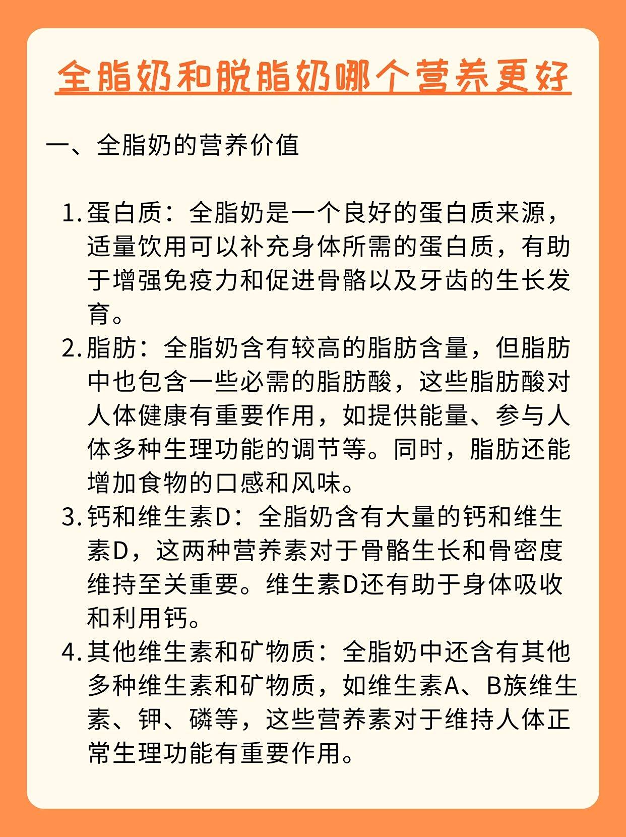 2 营养成分 全脂奶粉含有丰富的脂溶性维生素如维生素ADEK热量较高,口感更浓郁,奶香味更足脱脂奶粉脂肪含量低,热量较低,适合控制热量摄入的人群脂溶性维生素含量较少,但蛋白质钙等水溶性营养素的含量与全脂奶粉接近3 口感和用途 全脂奶粉口感更香浓,适合直接冲泡饮用。