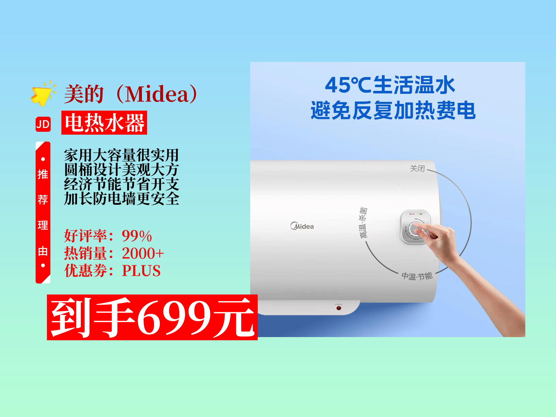 4在“模式”设置项,有四种模式增容,冬季模式,夏季模式,按模式键进行切换在相应的模式下,可以使用屏幕左侧的+,键进行温度的调节5在“功率”设置项,有1000W,2100W,2500W三种选择,按功率键进行切换相关情况介绍说明1美的F5021B1数显双码 电热水器超长低热负荷发热管,寿命更。