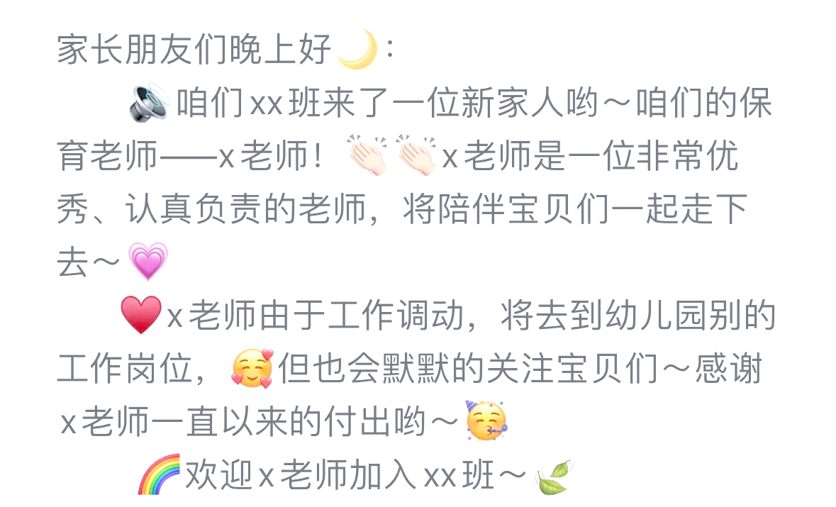 该新进人员进群家长发欢迎话的参考如下当新老师加入家长群时,家长们的欢迎语应该体现出尊重热情和期待如“欢迎新老师的加入您是孩子们成长道路上的重要一员,希望您能够给孩子们带来更多的启示和知识我们家长会全力支持您的工作,也期待您能够与孩子们建立深厚的师生关系”。