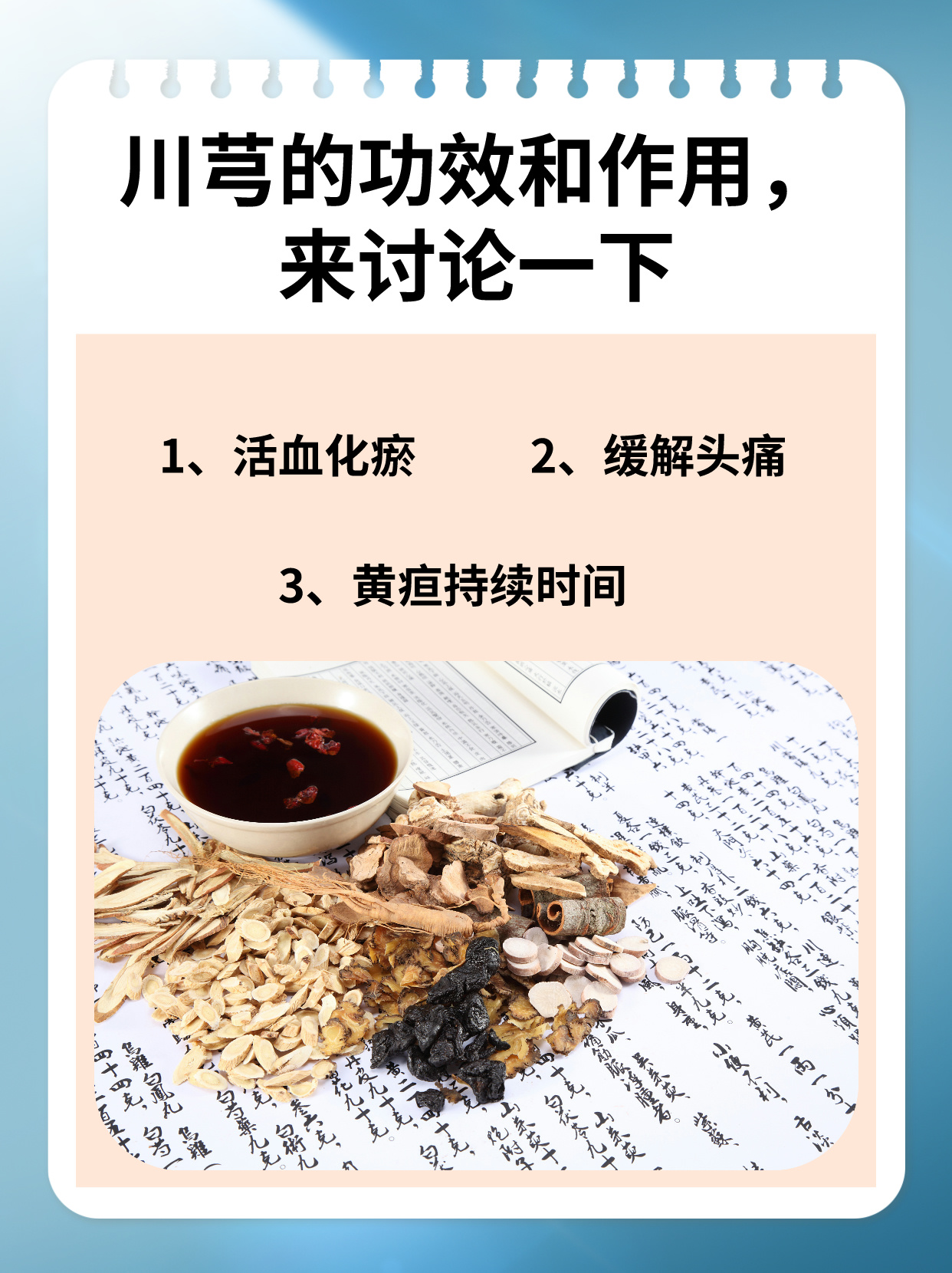 6、一功效与作用 1活血行气川芎辛温,归肝胆心包经,能促进血液循环,改善气血运行不畅其活血作用可缓解因瘀血阻滞导致的痛经闭经产后腹痛等症状行气功能则有助于疏解肝郁气滞,改善胸闷胁痛等不适现代研究表明,川芎中的川芎嗪等成分可扩张血管抑制血小板聚集,对心血管系统有保护作用。