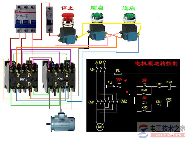 7、380伏电机2个接触器为避免烧电机接线方法如下1将二个接触器的上端电源输入接点按相同的相序连接,下端输出接点中间触头相连接2第一个接触器的左触头与第二个接触器的右触头连接3第一个的右触头与第二个的左触头连接即可。