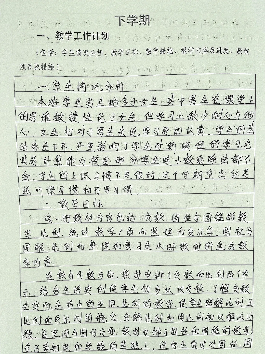 六年级下学期数学教学工作计划合集一 一教材分析 1教材内容简介本册教材内容分为“圆柱和圆锥”“正比例和反比例”和“总复习”三部分“总复习”包括4个单元 一圆柱和圆锥包括“面的旋转”“圆柱的表面积”“圆柱的体积”“圆锥的体积”4个课题 二正比例和反比例包括“变化的量”“。