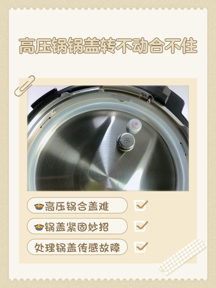 高压锅盖子错位卡住打不开的处理方法如下冷却后操作在高压锅完全冷却后,取下限压阀握住锅盖手柄,反复左右转动,直到锅盖松动松动后,即可轻松打开高压锅盖用筷子顶活钉如果高压锅锅盖错位且转不动,但钩盖和锅身之间存在一定空隙可以使用筷子,将手柄上方往下卡的活钉顶上去这样操作后。