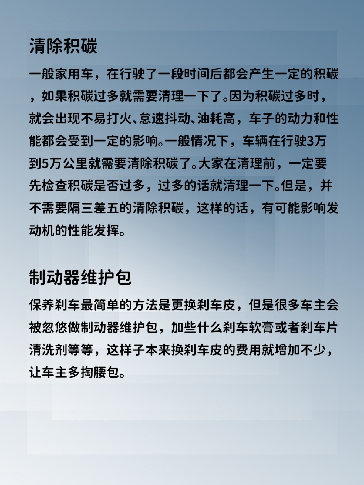 9、1最常见的就是拆卸节气门用化油器清洗节气门正反面,用棉布擦干即可一般一年或者2万公里建议清洗下节气门,当然不同车型会有不同的清洗周期,我们可以按照保养手册来做2发动机内部积碳清理,我们可以在要更换新机油之前做打开机油盖,加入清洁剂,与旧机油混合,怠速运转10分钟左右即可清洁剂。