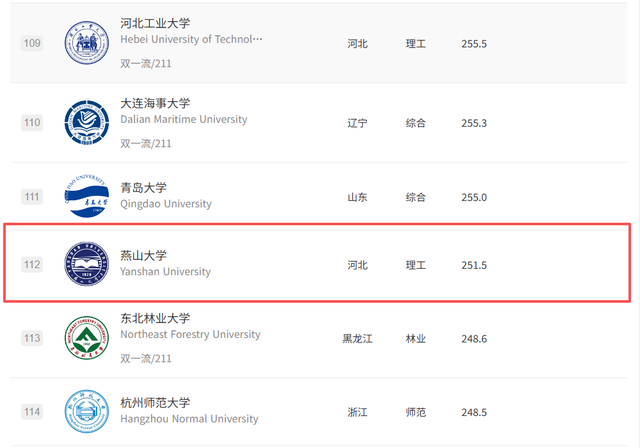 虽然燕山大学既不是“985”、“211”,也不是“双一流高校”,但是它的实力一点也不差,在软科2025年中国大学排名中,燕山大学排在全国高校第112位。
