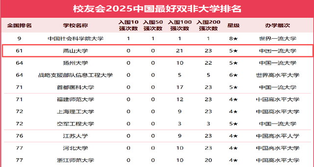 在校友会2025中国最好双非大学排名中,燕山大学仅次于中国社会科学院大学,位于全国61位。