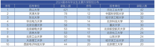 在学生升学上,2024届共有231个研究生招考单位录取燕山大学本科毕业生,其中录取人数在20人以上的“双一流”院校为21个,天津大学、东北大学、华北电力大学录取该校本科毕业生人数最多。