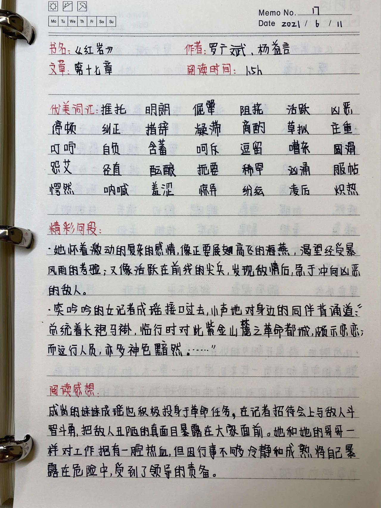 红岩读书笔记摘抄 一好词摘抄 掩人耳目遮掩别人的耳朵和眼睛,比喻用假象迷惑人,欺骗人 风吹草动风稍微一吹,草就摇晃比喻微小的变动或动静 倾巢出动倾倒出巢,比喻敌人出动全部兵力进行侵扰 整装待发整理好行装,准备出发,形容事情准备充分,即将行动二好句摘抄及赏析1 “;1这里是邻近市中心的住宅区,路边栽满树木,十分幽静,新年里街道上也很少行人2圆桌铺上了台布,添了瓶盛开的腊梅,吐着幽香一些彩色贺年片和几碟糖果,点缀着新年气氛3仓仓皇皇的人力车案的喊叫声和满街行人的喧嚣声,使节日的街头,变成了上下翻滚的一锅粥4这个匆忙走着的青年,便。
