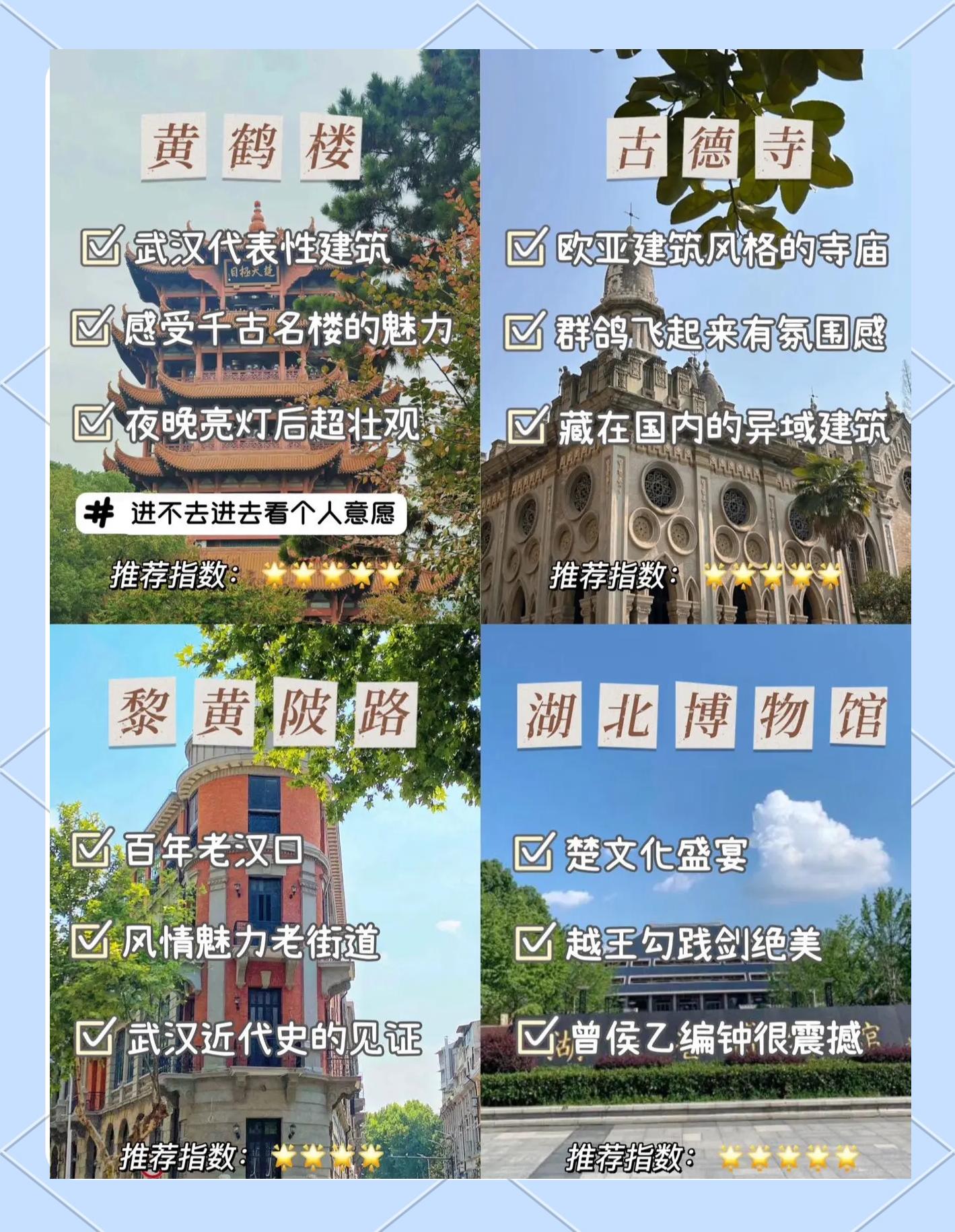 8、2022年武汉旅游必打卡的去处攻略一必游景点 黄鹤楼作为武汉的标志性建筑,黄鹤楼不仅历史悠久,而且风景绝佳登上楼顶,可以俯瞰整个武汉市的璀璨夜景,是拍照留念的绝佳地点此外,黄鹤楼雪糕也是不可错过的特色美食东湖东湖风景区广阔而美丽,是武汉市民休闲的好去处在这里,你可以感受到日漫。