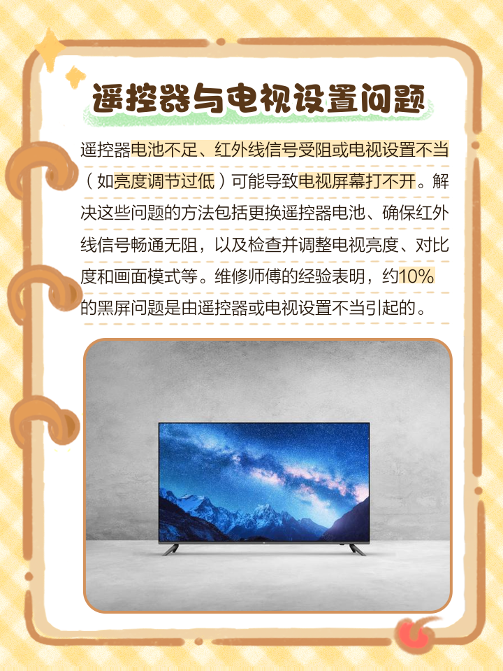 当电视机待机后无法打开时,可能存在以下几种情况和对应的解决方法1 电源问题首先检查电视机是否插入了电源插头,确保插头插紧且电源线没有损坏如果电视机依然无法打开,尝试将插头接入其他电源插座,以确定插座是否正常工作2 遥控器问题检查遥控器是否有电,是否正常工作可以尝试更换遥控器的。
