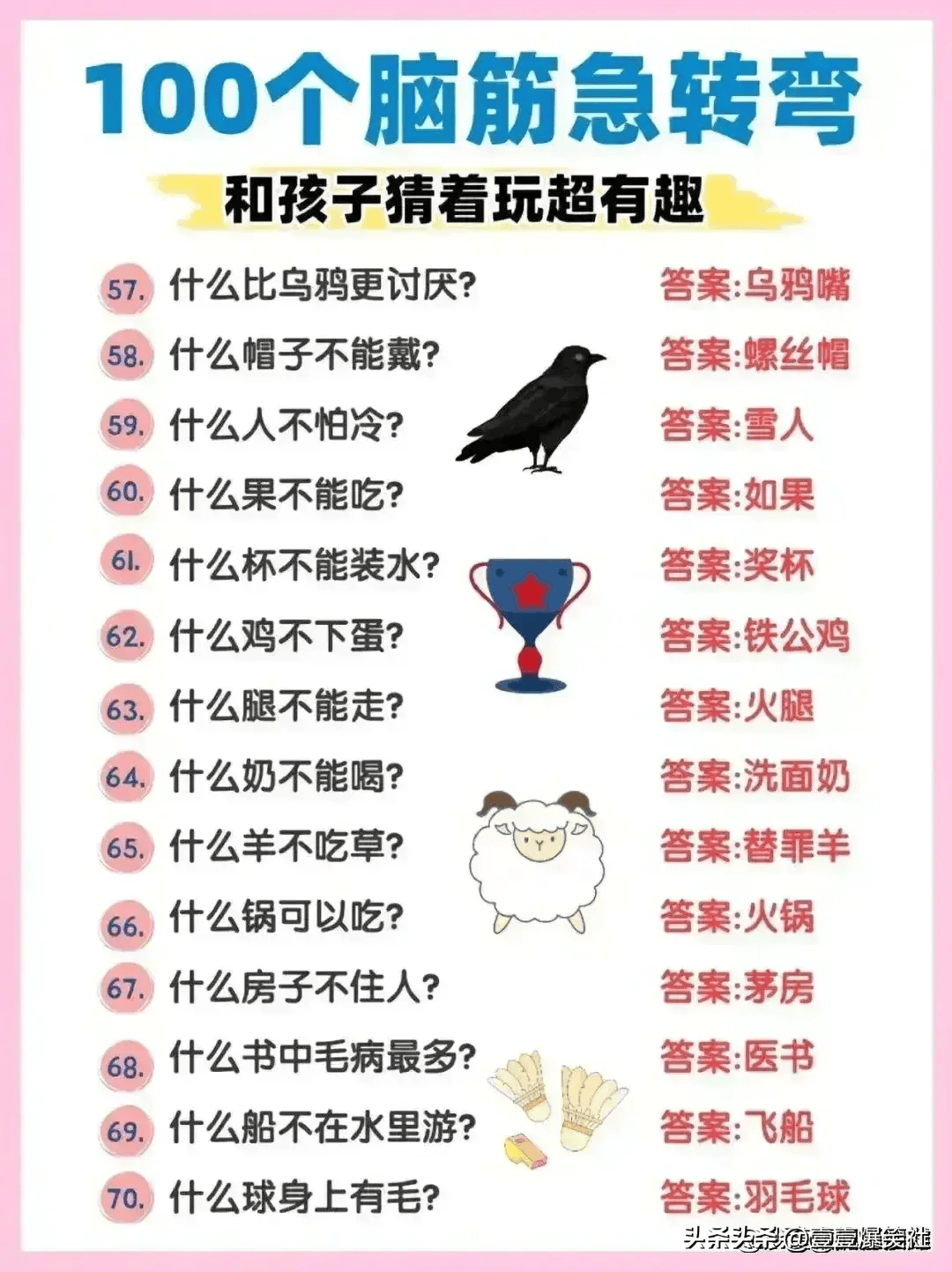 以下是100个搞笑脑筋急转弯的答案及解析小军小明是邻居,同楼同班又是同桌,天天一起去上学可是,一个出门往左拐,一个出门往右拐,为什么答案他们是对门邻居爸爸什么时候像个孩子答案在爷爷面前中国的内地生产什么答案玉,“国”字的中间是个“玉”邻居老李家的屋顶为什么有时。