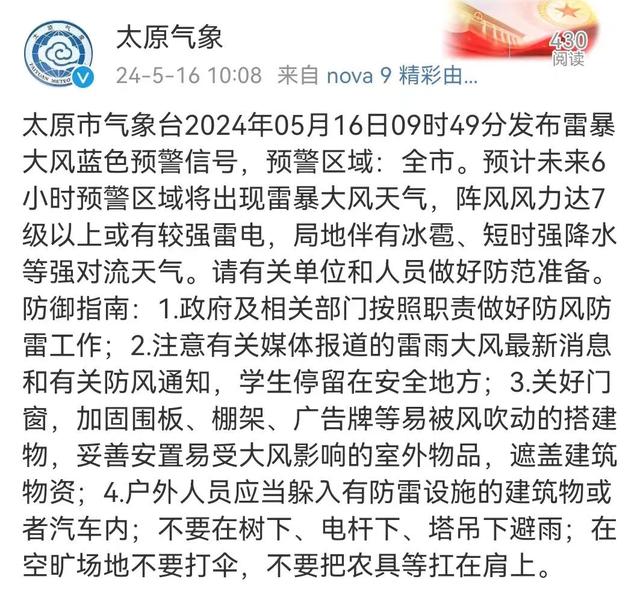 5月16日上午,太原市气象台发布雷暴大风蓝色预警信号,预计全市未来6小时将出现雷暴大风天气,阵风风力达7级以上或有较强雷电,局地伴有冰雹、短时强降水等强对流天气。