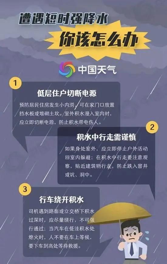 短时强降水发生时尽量减少开车出行,并避免在低洼地带停留。必须外出时,通过积水路段应确认安全后再通过,警惕山洪、滑坡、泥石流等灾害。