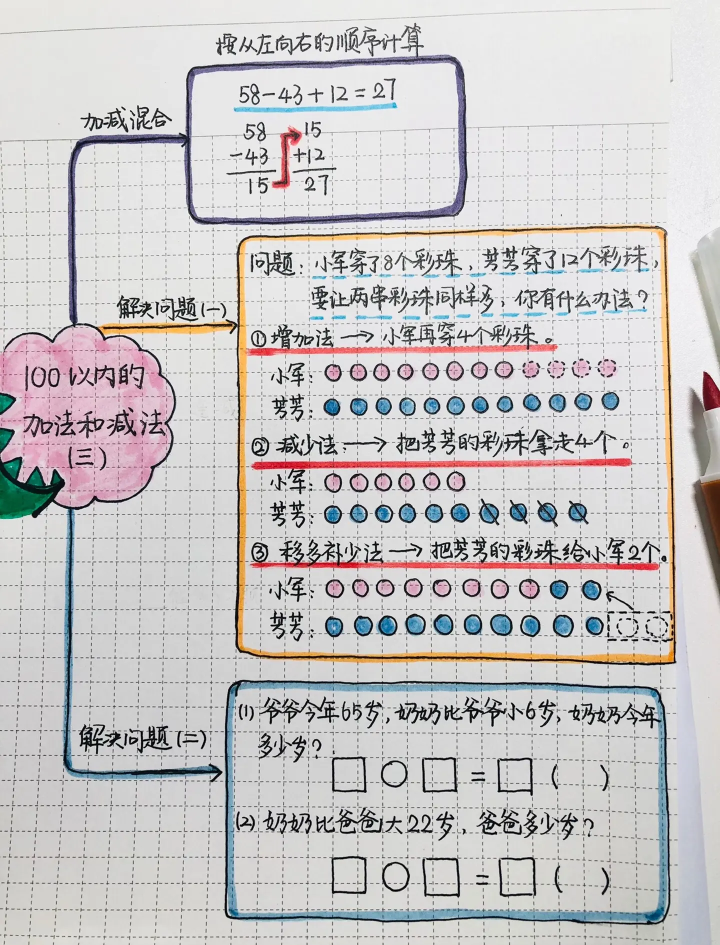 一年级100以内加减法速算技巧主要包括进位加法和退位减法两部分,具体技巧如下进位加法计算方法 基本原则基于20以内的加法原则 速算口诀 几+9,进1减1 几+8,进1减2 几+7,进1减3 几+6,进1减4 几+5,进1减5 几+4,进1减6 几+3,进1减7。