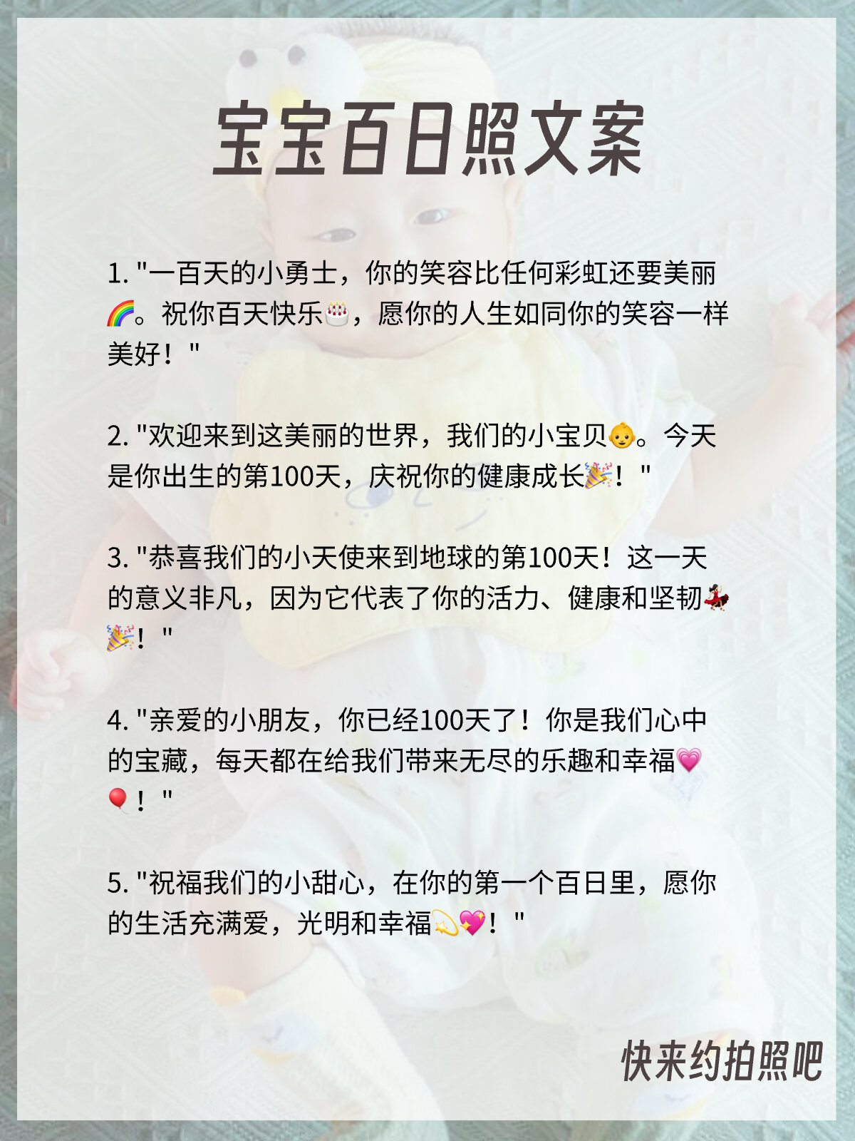 4、例如bull“金玉满堂,麟儿初长,愿孩子百日喜乐安康,来日鹏程万里”bull“百岁之喜,平安顺遂,盼小宝贝长成松柏之姿,心怀明珠之光”二生活祝福类短句用通俗语言传递细腻情感,适用于同龄朋友或轻松场景bull“一百天的小脚丫已踏稳人间烟火,愿未来每一步都有阳光铺路”bull“。