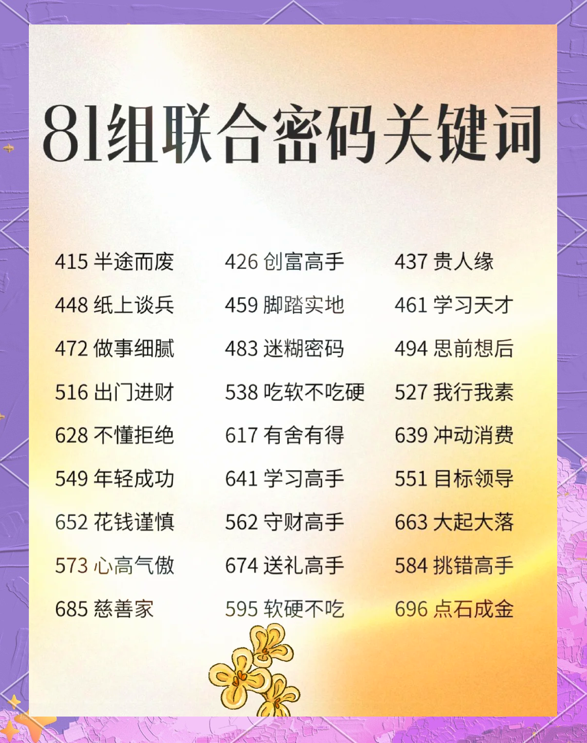 4、六位数字寓意密码之四如等,这些组合同样富含吉祥和顺利的寓意例如,“”代表着顺利吉祥,一切顺遂“”则是对爱情的深情承诺,寓意着始终如一六位数字寓意密码之五如等,每个数字都蕴含着特别的寓意例如,“”寓意。