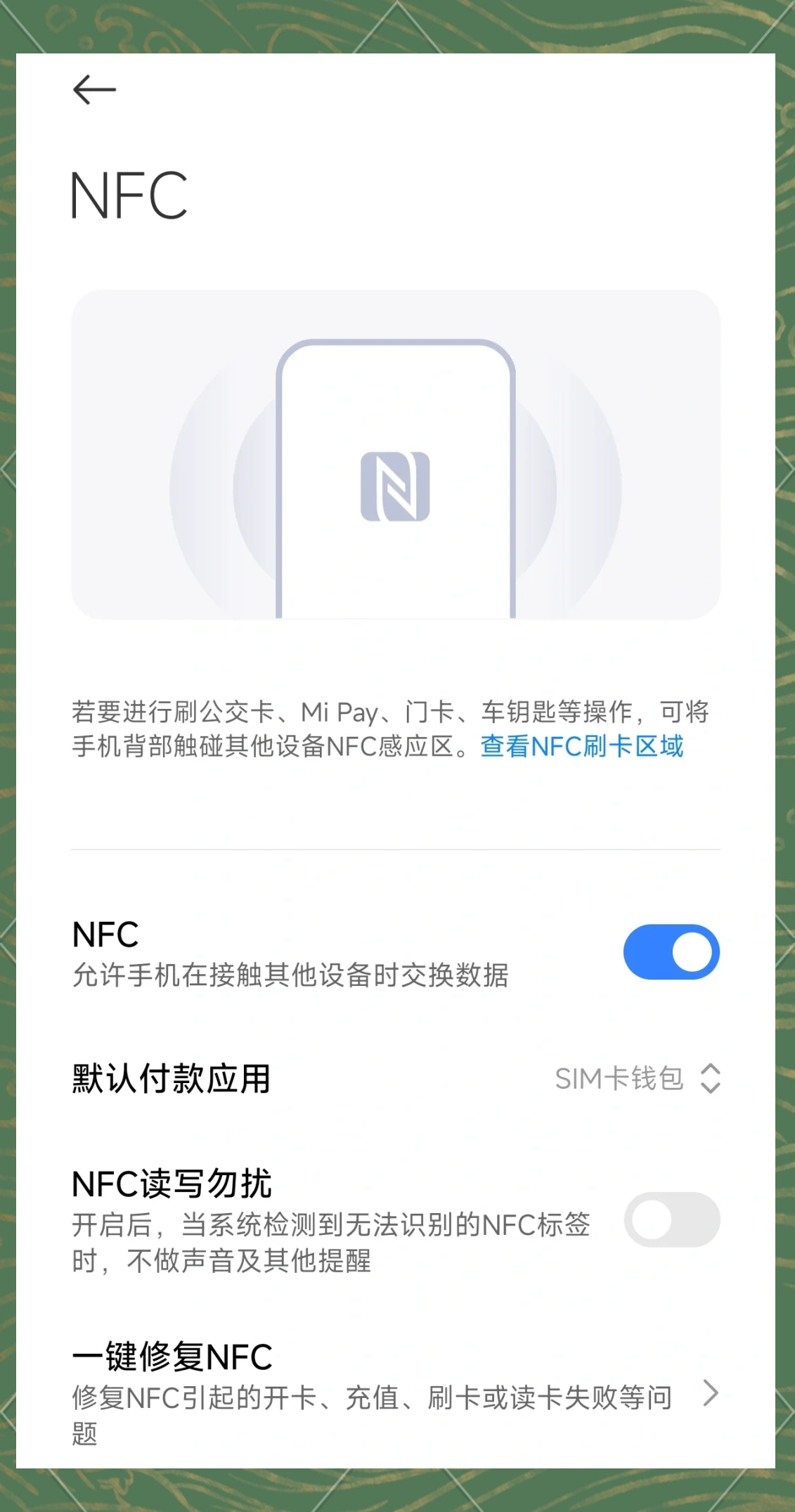 7、手机上NFC是一种近距离无线通信技术功能,可实现设备间非接触式数据传输与交互,主要功能包括交通卡门卡及智能门锁模拟移动支付等交通卡功能用户可通过手机NFC开通交通卡,乘坐公交或地铁时,只需将手机贴近刷卡机即可完成支付,无需额外携带实体交通卡该功能通过模拟交通卡数据实现,支持多数城市的。