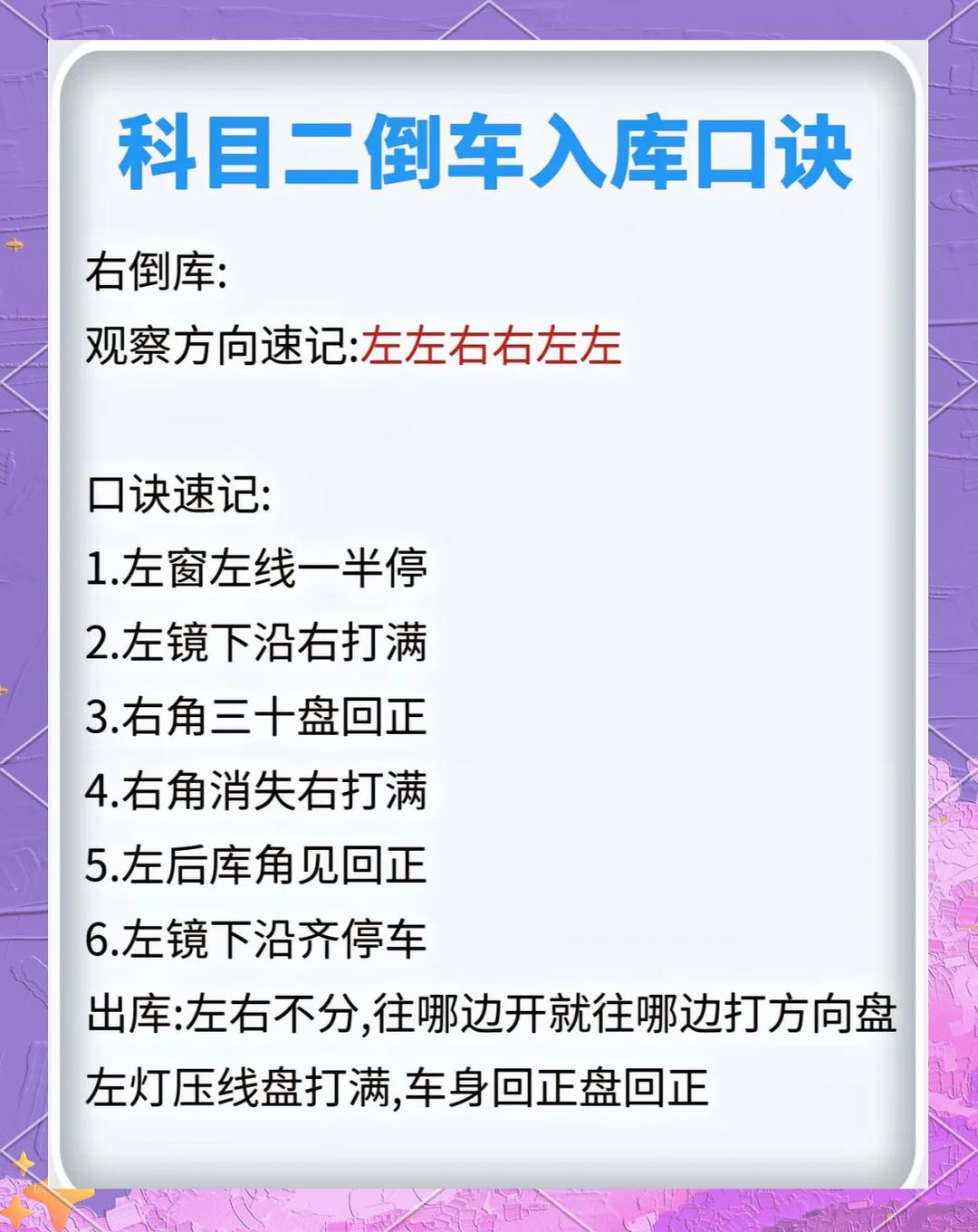 2、新手倒车技巧口诀如下1倒车入库有原则,车身要直前后齐2右倒车库有诀窍,转向可早不可迟3早了见角回圈,迟了神仙也难医4左右后视见库底,两边库底差不离5回正方向尽量急,车身若偏小幅移6整车入库才停车,出库左灯莫忘记7手中方向松三分,回库距离隔半米8;靠右倒车入库车头入库最简单的方法是通过固定点位和后视镜观察实现“一把入库”,具体步骤如下初始定位与平行行驶沿车位库位线平行向前行驶,保持车身与库位线约5080厘米距离,确保车头不剐蹭前方车辆或障碍物此步骤需通过观察车头与库位线的相对位置调整方向,保持直线行驶第一停车点定位当驾驶;倒车入库的3个实用技巧如下一非字形停车位 停车定位将车停在车位线旁约15米处车型较大时建议2米,小巧车型如Smart可紧贴车位线打方向时机当车处于隔一个车的车位中间时,方向盘向左打满,缓慢倒车回正调整感觉车头正时,立即回正方向盘并继续倒车若距离车位线过近易刮擦旁车,可停车观察后再。