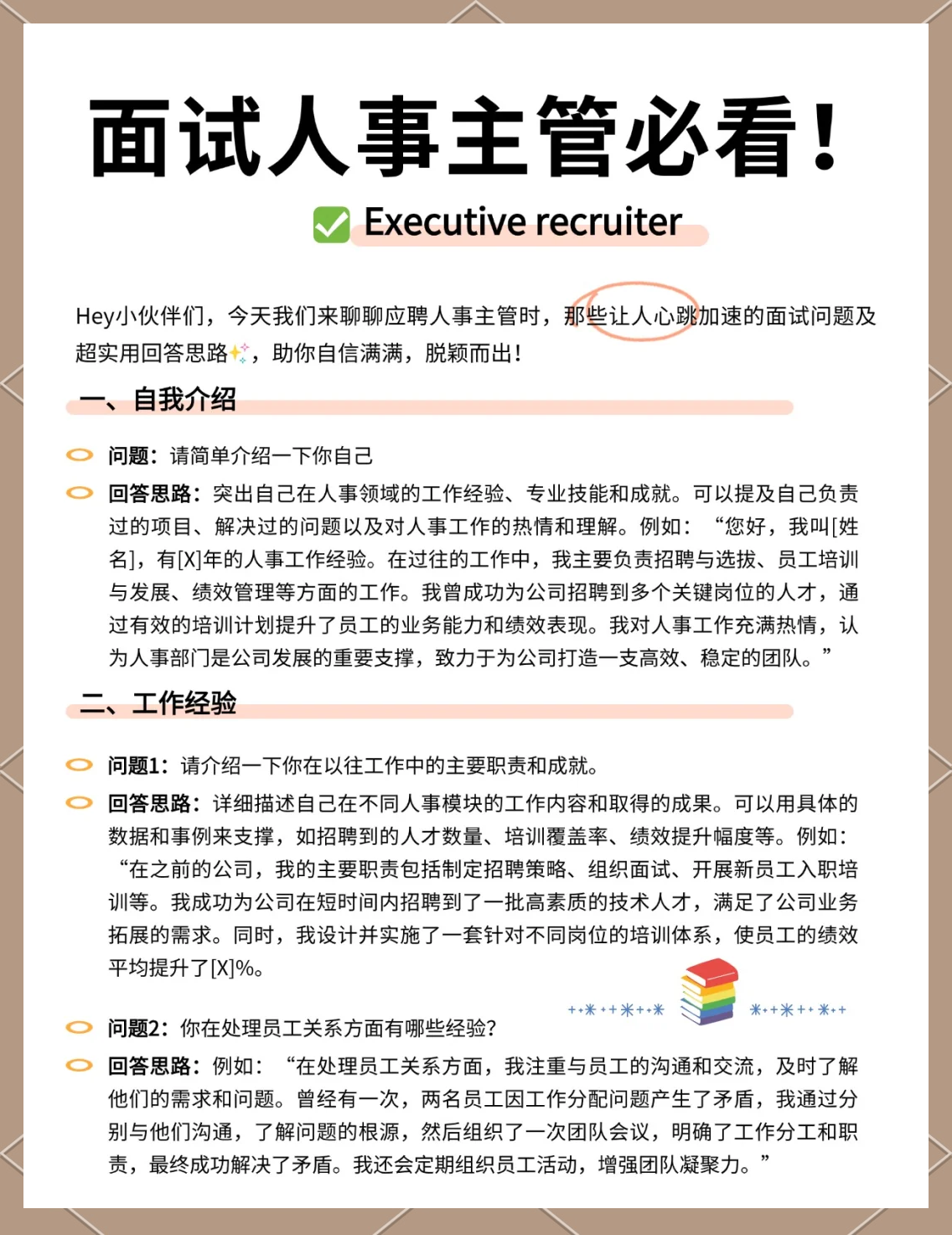 面试人事工作时,面试官通常会围绕以下几个核心方面提出问题,以评估应聘者的专业能力工作经验问题解决能力和对公司及岗位的适应性以下是可能遇到的问题及简要解析1 工作经历与岗位经验 问题示例请简述你的工作经历,特别是与人事工作相关的经验,以及你在此岗位上工作了多久答案要点如实介绍。