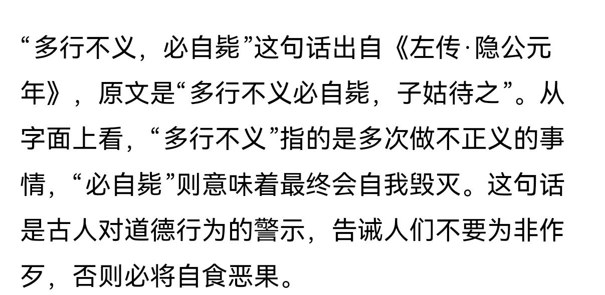 14、quot多行不义必自毙quot的意思是,一个人如果反复做不道德的事情,最终会导致自己的灭亡这句话通常作为宾语或分句出现在句子中它的读音是quotduō xíng bù yì bì zì bìquot这句话出自左传·隐公元年“多行不义必自毙,子姑待之”例句1作恶多端的人必然没有好下场,正如古语所说,“。