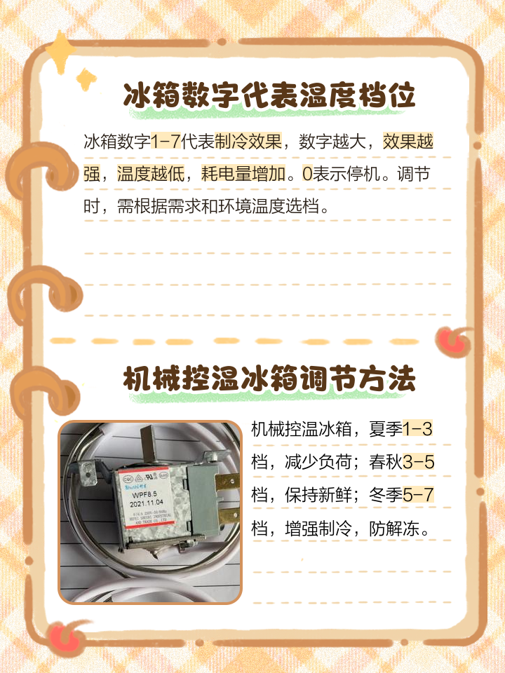 10、冰箱制冷档位调节要综合考虑季节食材量等因素,并非固定某一档位最省电又保鲜一般来说,春秋季可设为3档,夏季设为2档,冬季设为4档一春秋季环境温度适中,冰箱内外温差相对较小此时将制冷档位调至3档,既能保证食材有适宜的保鲜温度,又不会因压缩机过度运转而消耗过多电量比如,存放。