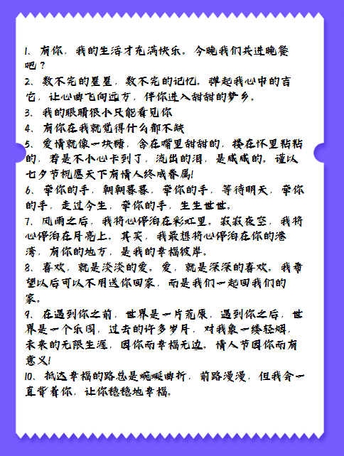 31七夕之夜,写张给牛郎给织女的贺卡,让它飞翔在天际!写出你心中我心中的话语,永恒美丽的相遇!七夕节快乐!32情人节要到了,欢迎各位小伙伴请我去当电灯泡,管饭就行,我会该闭嘴的时候闭嘴,气氛尴尬的时候讲笑话33你的过去我来不及参与,你的未来我不会再错过!真诚之中,与你相识相知。