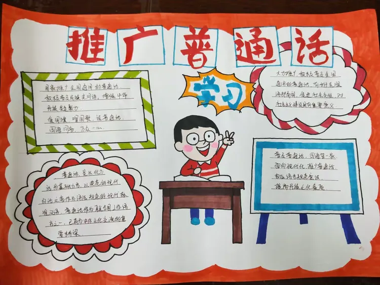 推广普通话手抄报内容主要包括以下几个方面普通话的定义普通话是以北京语音为标准音,以北方话为基础方言,以典范的现代白话文著作为语法规范的现代汉民族共同语推广普通话宣传周自1998年开始,每年9月份的第三周被定为推广普通话宣传周例如,2007年为第十届推广普通话宣传周讲普通话的重要性促。