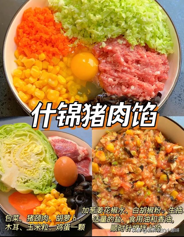 什锦猪肉馅,包菜、猪颈肉、胡萝卜、木耳、玉米粒搭配一颗鸡蛋,营养特别丰富。调味时加葱姜花椒水、白胡椒粉、生抽等,顺时针搅拌上劲,咬一口,各种食材的口感和味道融合得特别好,肉的香、菜的鲜、玉米的甜,层次超丰富。