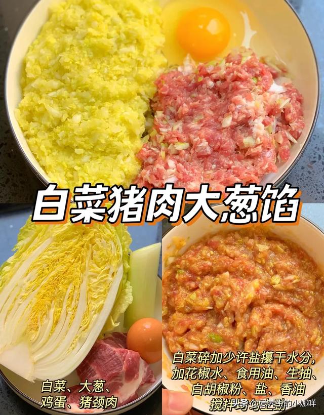 白菜猪肉大葱馅,经典的白菜猪肉馅,加入大葱和鸡蛋,味道更上一层楼。白菜碎加少许盐攥干水分,和猪肉馅一起调味,吃起来就是小时候的味道,家常又美味。