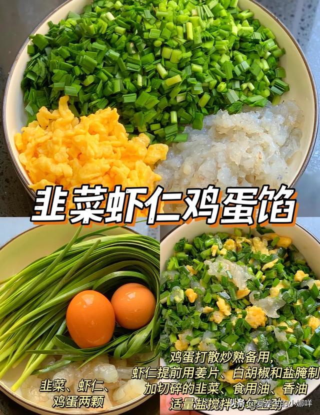 韭菜虾仁鸡蛋馅,韭菜、虾仁、鸡蛋的组合,鲜掉眉毛不是吹的。鸡蛋炒熟,虾仁用姜片、白胡椒和盐提前腌制,再和切碎的韭菜拌在一起,加食用油、香油和适量盐,搅拌均匀。这馅的鲜味特别突出,喜欢吃海鲜饺子的一定不能错过。