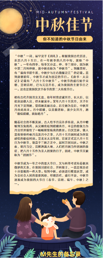 2、时间由来每年农历八月十五日,正值秋季的中期,因此这一天被称为中秋文化寓意中秋夜,人们仰望明亮的圆月,自然期盼家人团聚远在他乡的游子也借此寄托对故乡和亲人的思念,因此中秋又称“团圆节”。
