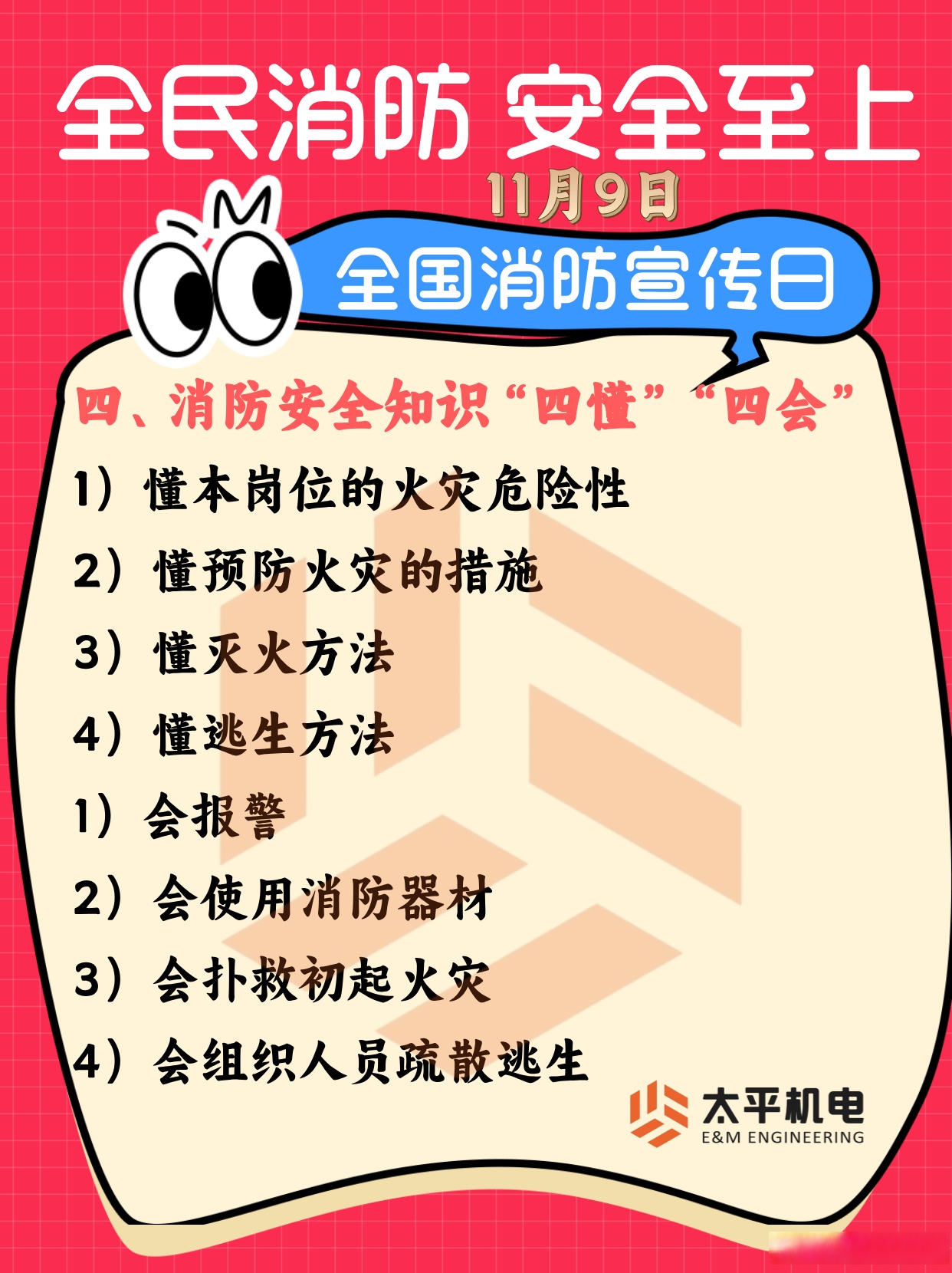 4 消防安全教育与宣传 提升公众消防安全意识和能力通过教育是至关重要的通过各种媒体和渠道宣传消防安全知识,让更多的人了解其重要性,是消防安全工作的必要组成部分以上内容共同构成了消防安全的主要框架掌握这些关键消防安全知识对于降低火灾风险和减少火灾损失极为重要因此,每个人都应当加强学习。