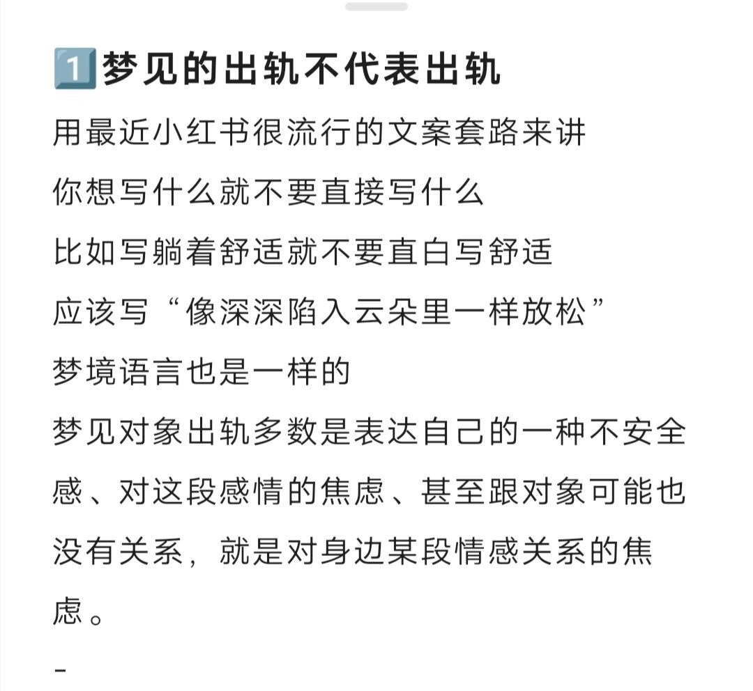 梦见老公有外遇,可能暗示你对于你的婚姻关系感到担忧,或者对老公的行为有所疑虑以下是 一梦境的心理学解读 梦境是人类心理活动的反映,常常与个人的情绪状态日常生活经历以及内心的担忧紧密相关梦见老公有外遇,可能反映了你对婚姻关系的某种担忧,或者对现实生活中老公的行为有所察觉,内心产生了。