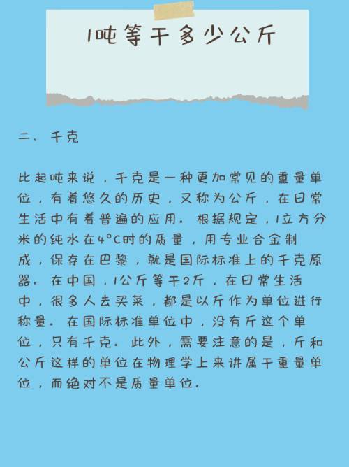 1000千克等于1吨根据质量单位之间的进率1千克=1000克,1吨=1000千克,所以1000千克KG=1吨t千克是质量的单位,而质量就相当于日常说的一样东西有多“重”吨和千克都是国际质量单位,他们之间的进制是1000,也就是说一吨等于1000千克,这是质量单位之间的一个换算常识,所以本题。