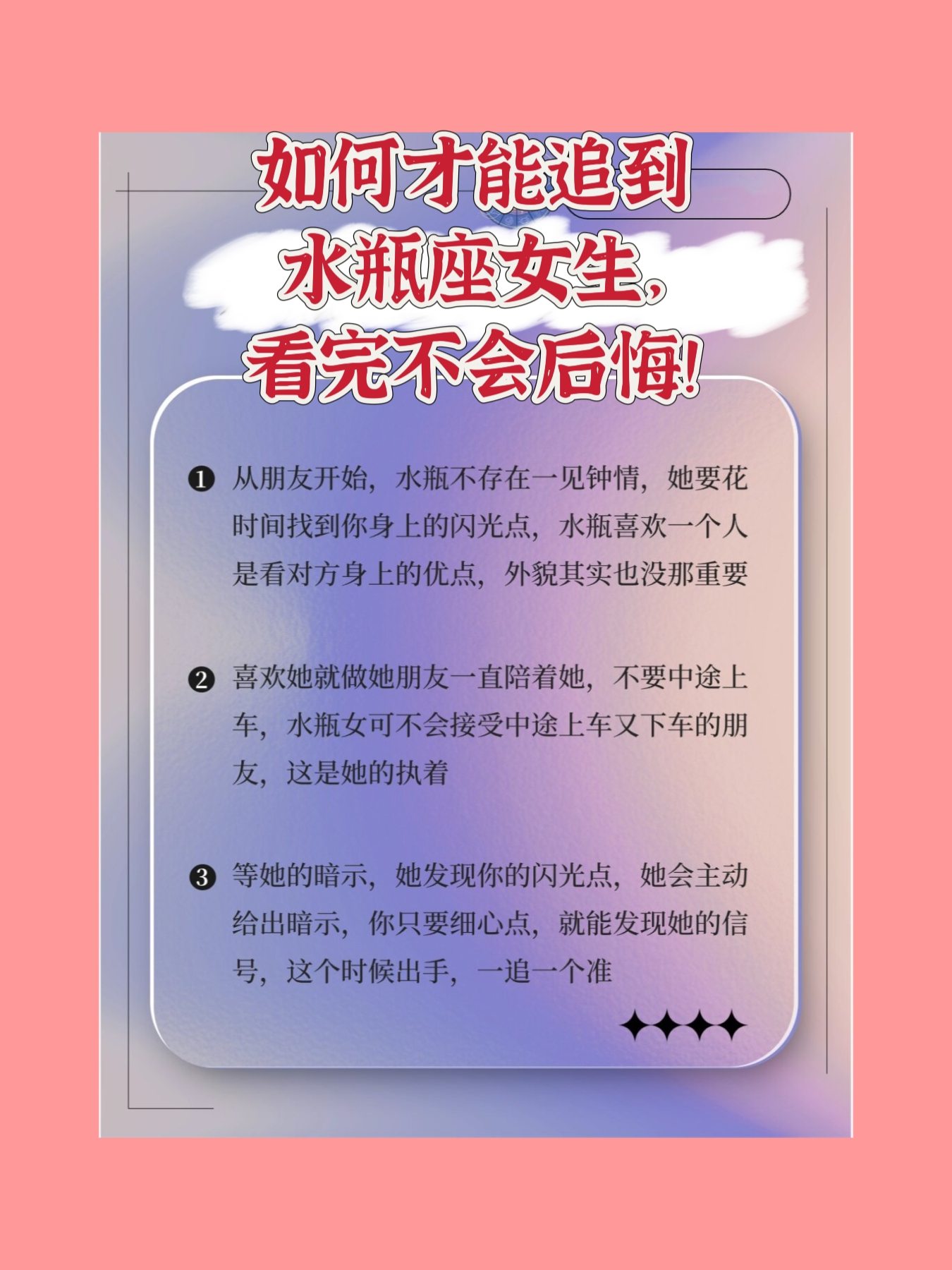 5温柔与笑容在你面前,摩羯男会显得特别温柔,态度温暖如春,而且见到你时经常面带微笑,他们的态度会流露出对你的特别关怀6喜欢逗乐爱你的摩羯男可能会喜欢逗你开心,他们会在你面前表现出难得的幽默和搞怪,甚至在你不开心时想方设法让你笑7对视时的闪躲摩羯男如果对你有感觉,可能;当摩羯座男生爱上水瓶女时,他们可能会选择低调地接近,通过频繁的沟通和共同规划未来生活来表达感情他们会渴望保护这个女孩,尽管不善于言辞,但行动上会展现强烈的关心和责任感他们对爱情有着明确的长远规划,包括婚姻和家庭的设想,这表明他们的决心和稳定性然而,当摩羯男彻底放弃时,他们的表现;喜欢聊天摩羯男在水瓶女面前会变得放松,喜欢与她聊天,分享自己的想法,展现自己与众不同的一面温柔且有笑意摩羯男对水瓶女会很温柔,态度如同春暖花开,且常面带笑意,态度上明显不同喜欢逗她摩羯男会逗水瓶女开心,在她不开心时哄她,展现出自己搞怪逗乐的一面对视时闪躲摩羯男与水瓶女对视时眼神会闪躲,这是因为他们对她有特别的。