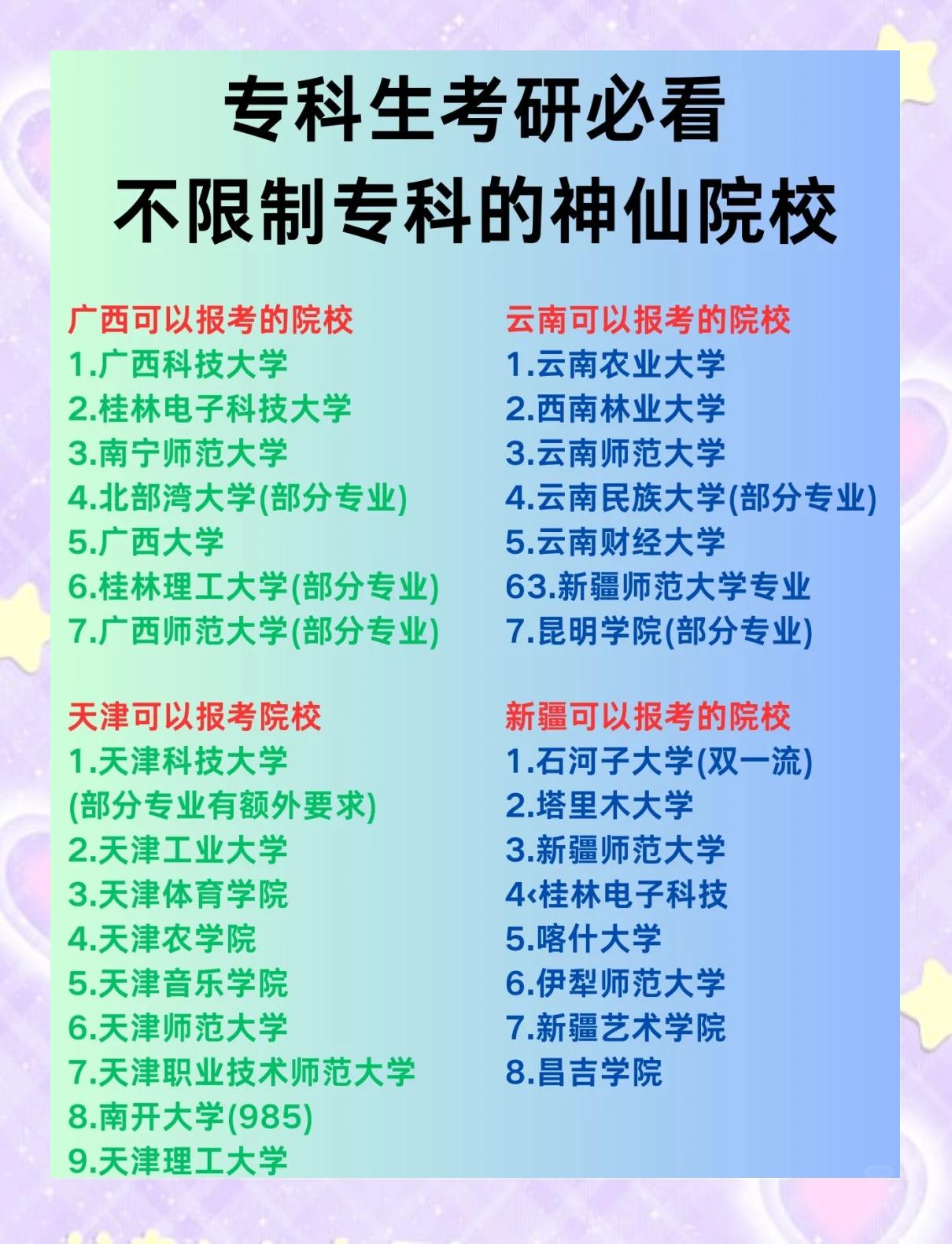 2、专科生不可以直接考研,但可以在毕业两年后或是达到同等学力本科也可以报考也可以选择专升本考试以本科生身份直接报考教育部对报考硕士研究生的考生资格要求为国家承认学历的应届本科毕业生及往届本科毕业生国家承认学历的专科毕业生报考硕士研究生,须毕业两年从专科毕业到录取为研究生当年的9月1;大专直接考研究生报考条件1毕业工作2年同等学历专科生取得国家承认学历包括电大,夜大,函大职大需要毕业2年或者2年以上,并达到与大学本科毕业生同等学历2专升本后再考也就是通过正规方法取得本科学历后可报考硕士生考试3要报考的院校要有招收专科生考研不是所有院校都有;记住你今年要考的是05年的研究生,也就是说你必须在03年9月前拿到专科毕业证成人高校应届本科毕业生以同等学历身份报考,成人教育学历是国家承认的成人教育本科往届生可以直接以本科生的资格报考而成人教育应届本科生由于报考时每年的11月中旬并没有取得本科学历,所以只能以同等学历的资格报考;大专文凭是可以考研的专科生考研需要在毕业两年之后,才会允许考研,考研的年龄大概在40岁以内 在校专科生除了毕业之后等两年之外,还有两种考研的方法,一是在学校大三的时候选择统招升本,考到统招本科院校继续读两年本科,在本科阶段选择考研二是在大学期间选择自考本科专套本,争取在大学期间把;专科生是可以考研的,但是与本科生直接考研会有很大的差别,专科生考研的过程当中会有很多限制条件,专科生只有满足了报考条件之后才可以考研究生首先毕业两年,并且已经获得国家承认的高职高专毕业学历,还需要达到与大学本科毕业的同等学力简单来说就是在工作两年之后,需要通过其他一些途径补上国家承认的本科学历才。