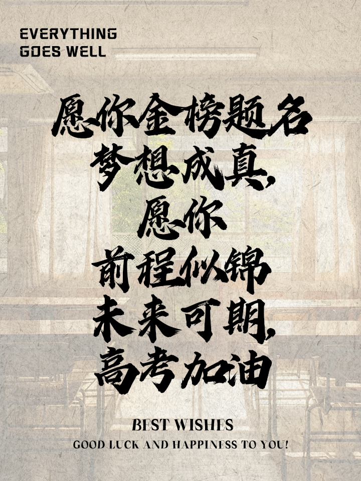 在高考来临之际,为学子送上真挚祝福能让他们更有信心与动力以下几种不同风格的祝福语可供参考文艺风“高考是一场青春的试炼,愿你以笔为剑,披荆斩棘,在这没有硝烟的战场上书写属于自己的辉煌愿你合上笔盖的那一刻,有着侠客收剑入鞘般的骄傲,金榜题名,梦想成真” 幽默风“嘿。