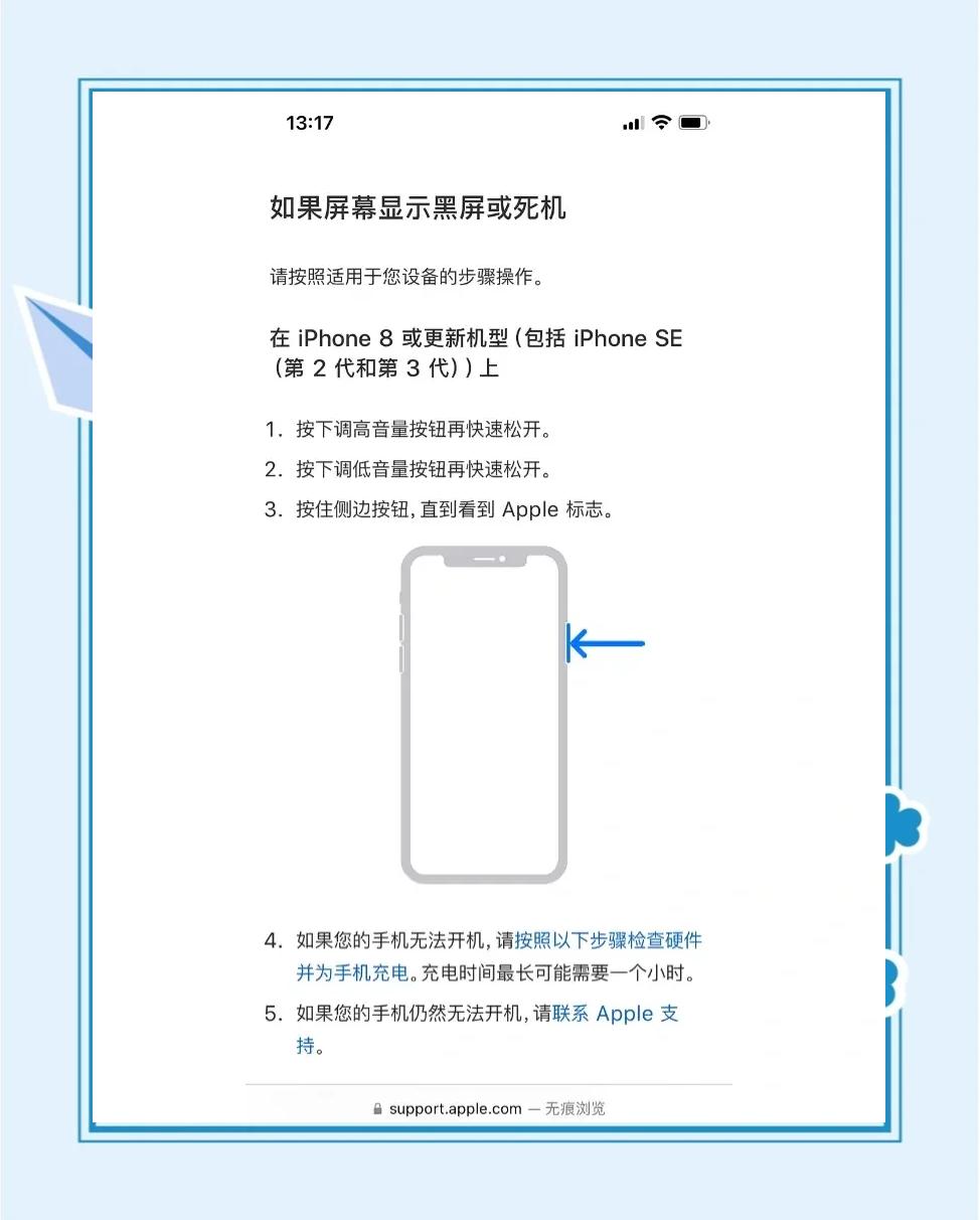 一强制重启 当苹果手机出现死机情况时,首先可以尝试强制重启设备对于配备面容ID的iPhone如iPhone X及更新机型,需要同时按住音量调高或调低按钮和侧边按钮,直到出现苹果标志而对于配备主屏幕按钮的iPhone如iPhone 6s至iPhone 8 Plus,则需要同时按住电源键也称睡眠唤醒按钮和home键,直。