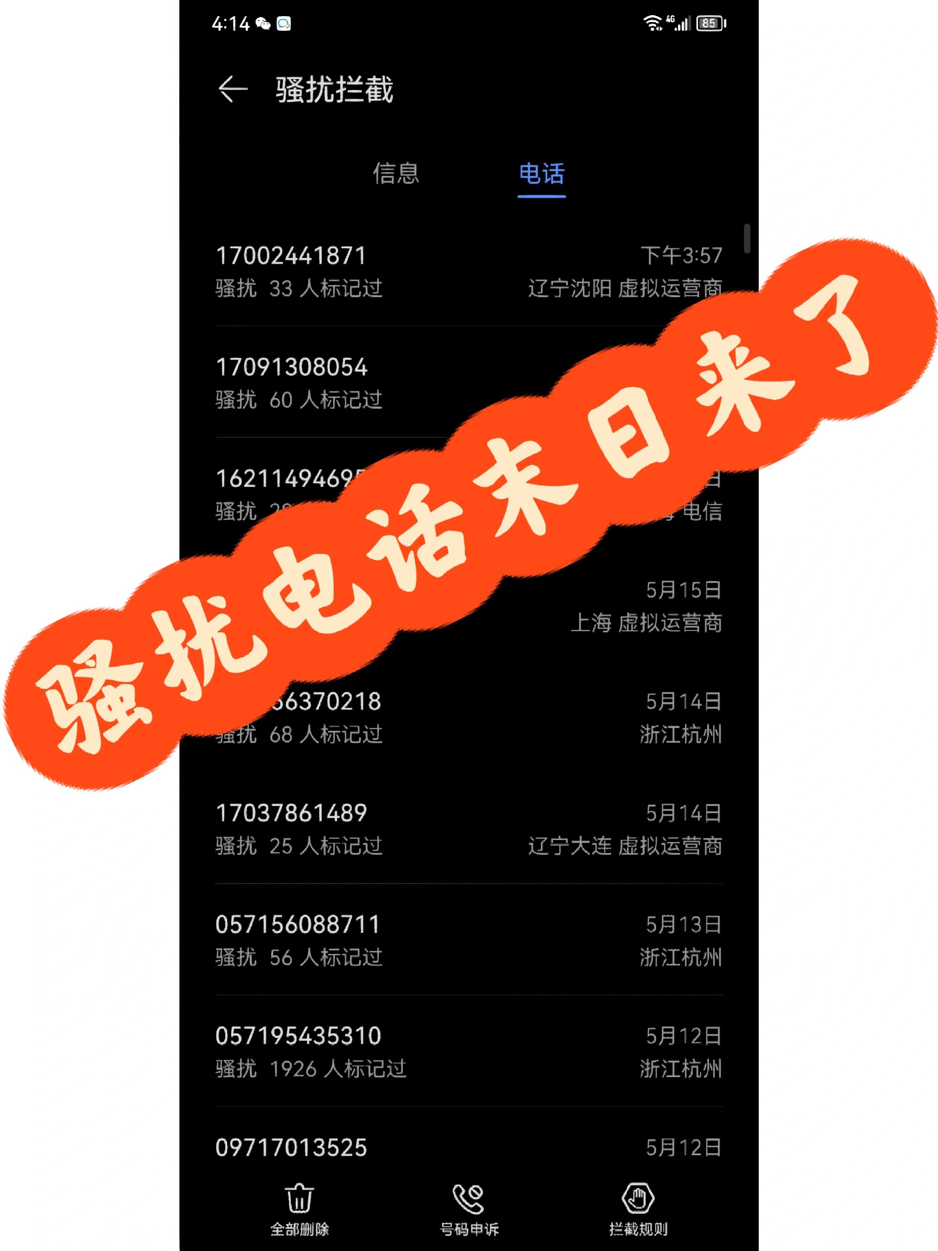 如果您使用的是华为手机,方法如下一过滤骚扰电话 1进入电话 四点图标 骚扰拦截 齿轮图标您也可以进入 手机管家 骚扰拦截 齿轮图标2点击电话拦截规则,开启需要的拦截规则开关二阻止特定用户的来电 通过以下任一方式阻止特定用户的来电1进入电话 四点图标 骚扰拦截。