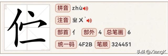 读音为“zhù”,同音字为“祝”,部首为“亻”,总笔画6,左右结构。